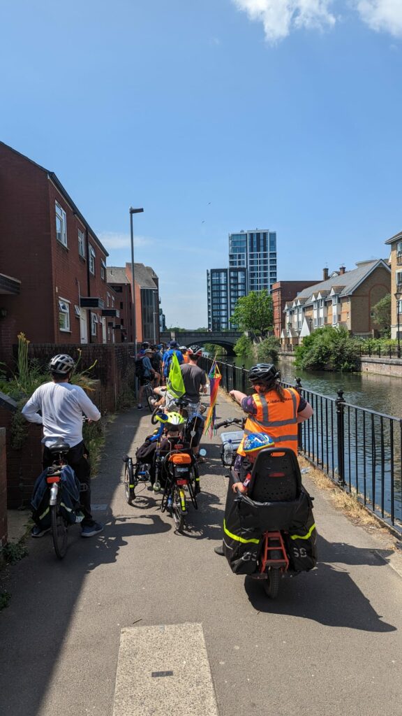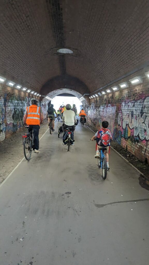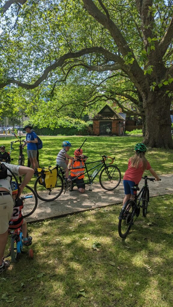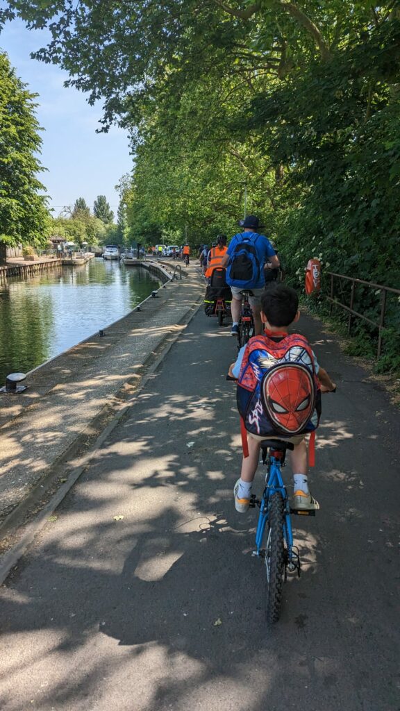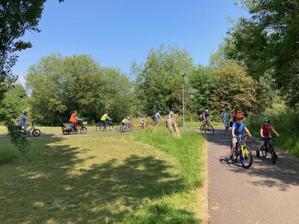 A few months later, the first COVID lockdown happened and traffic nearly disappeared. We bought the cargo bike and went cycling frequently, exploring the landscape on beautiful country roads. None of that is possible in the same way any more but it showed what it could be like. So, when Simon told us about the initiative to set up Kidical Mass, we were immediately on board and have been since the first Reading ride (sadly missed a few in-between, though). Back then, our little one was still on a balance bike but managed to ride about half the length on her own, before enjoying the rest comfortably in the cargo bike, watching her older sister pedal along with the group.