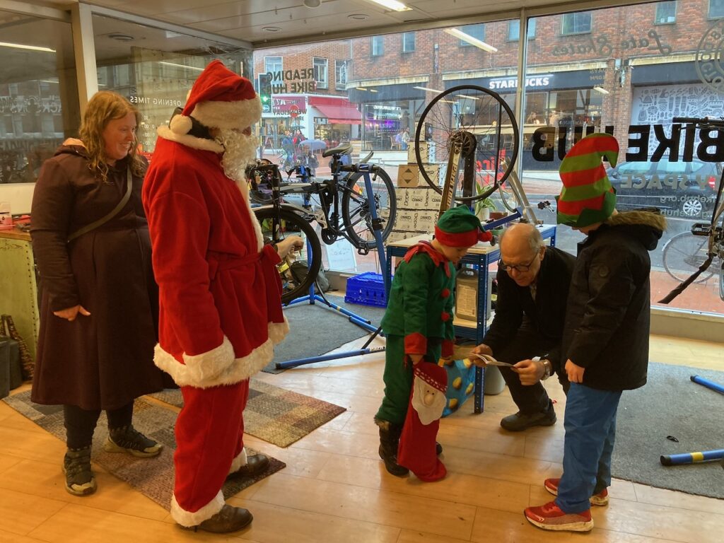We need to revisit our strategy for advertising the rides, because we clearly didn’t publicise the last two well enough. Our Christmas ride was a small and select group but those of us who came out still very much enjoyed the ride, particularly one happy little elf who loved riding with Santa. After the ride the elf enjoyed giving out copies of this year’s Kidical Mass Christmas book (see below) to the mechanics and visitors at the bike hub where we ended the ride.