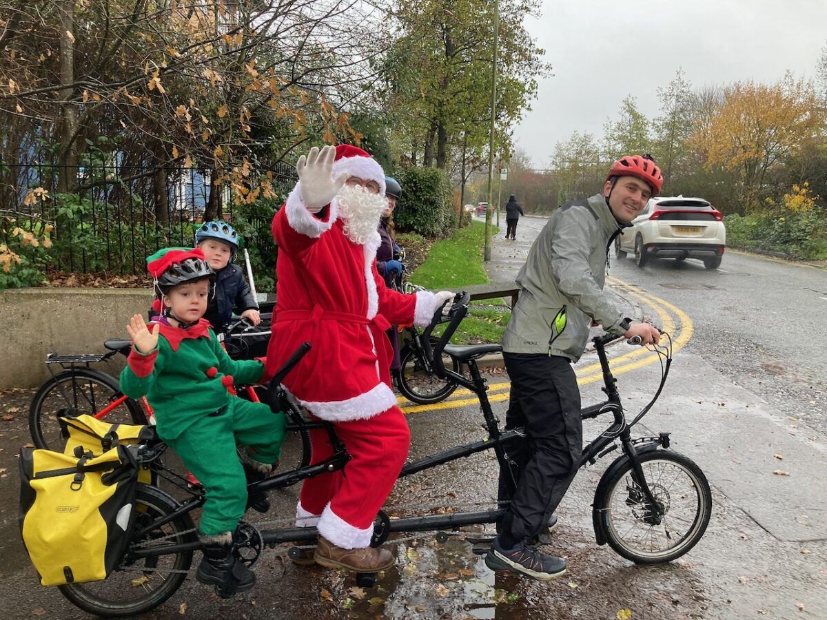 We need to revisit our strategy for advertising the rides, because we clearly didn’t publicise the last two well enough. Our Christmas ride was a small and select group but those of us who came out still very much enjoyed the ride, particularly one happy little elf who loved riding with Santa. After the ride the elf enjoyed giving out copies of this year’s Kidical Mass Christmas book (see below) to the mechanics and visitors at the bike hub where we ended the ride.